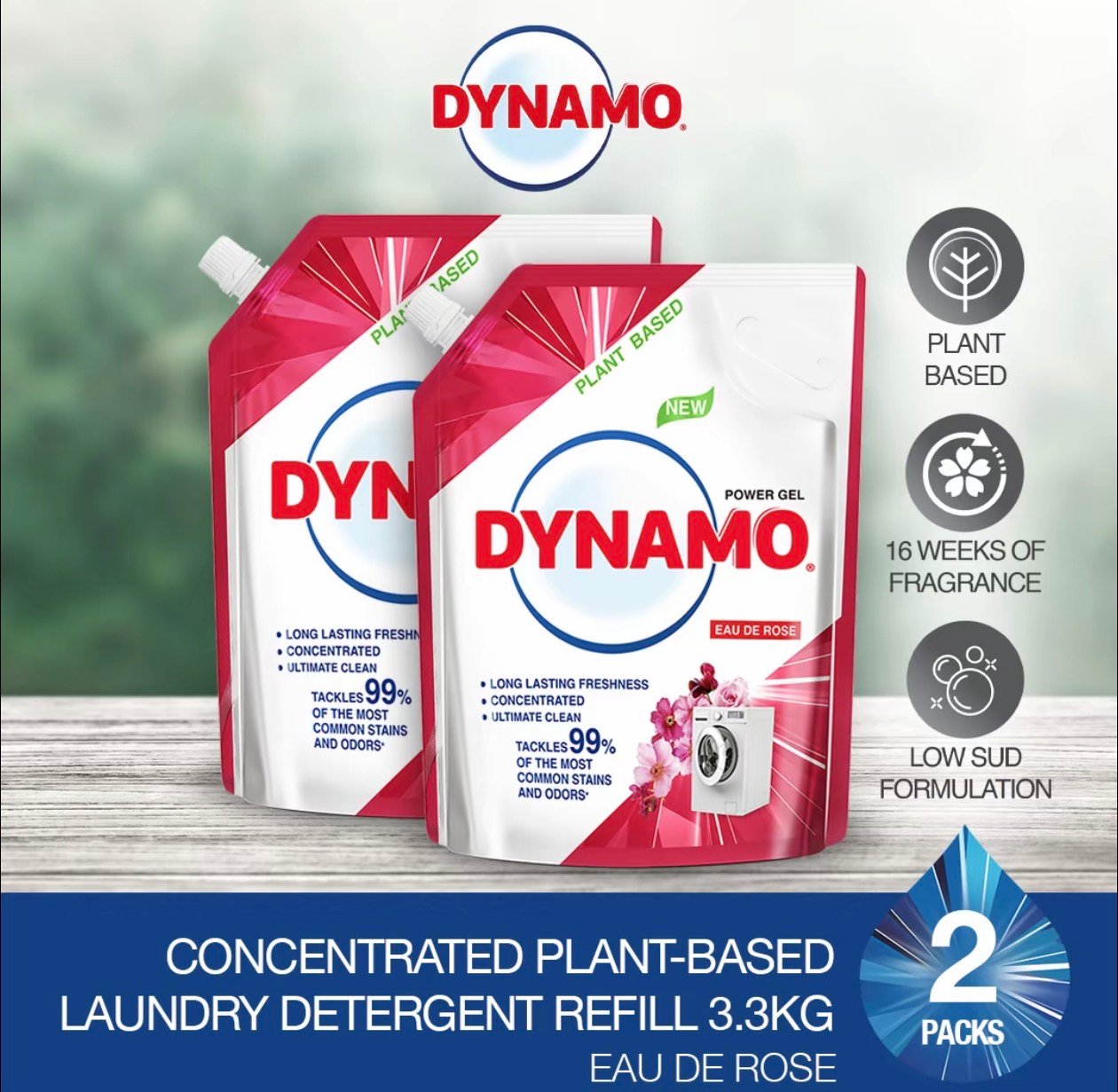 DYNAMO plant-based concentrated liquid detergent kills 99.9% bacteria and removes 99% of common stains for a fresher-smelling laundry, ensuring up to 72 hours of long-lasting anti-bacterial effect.