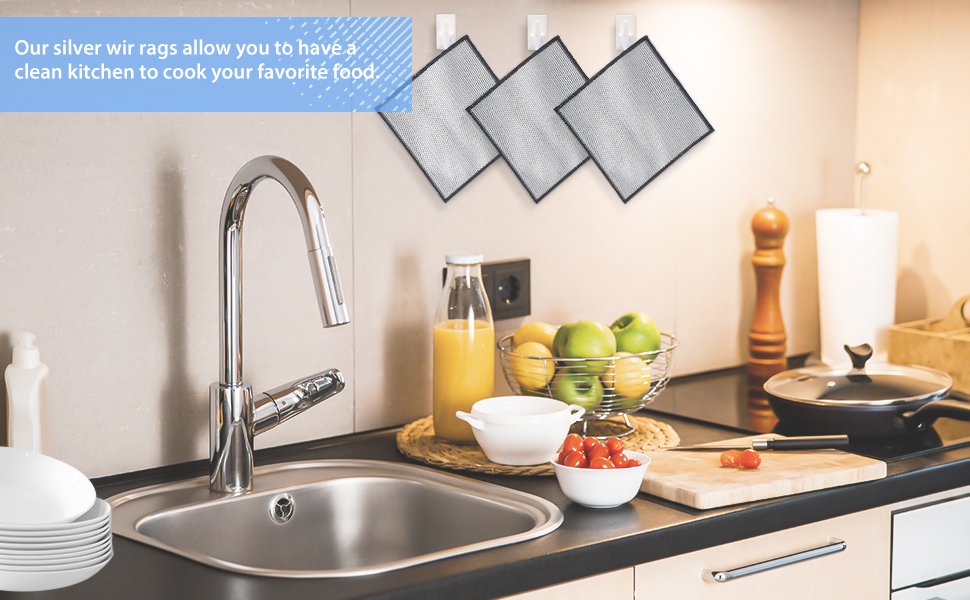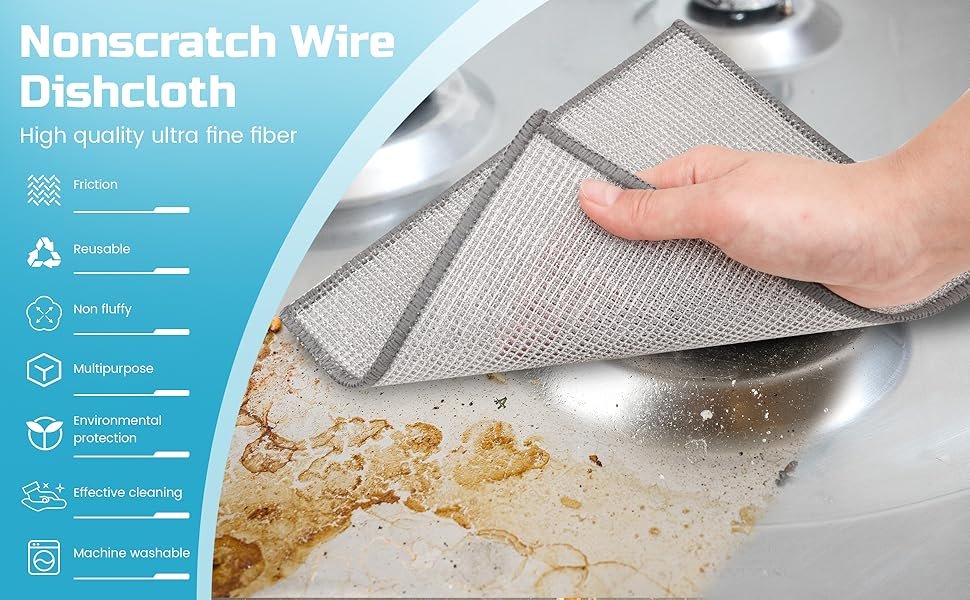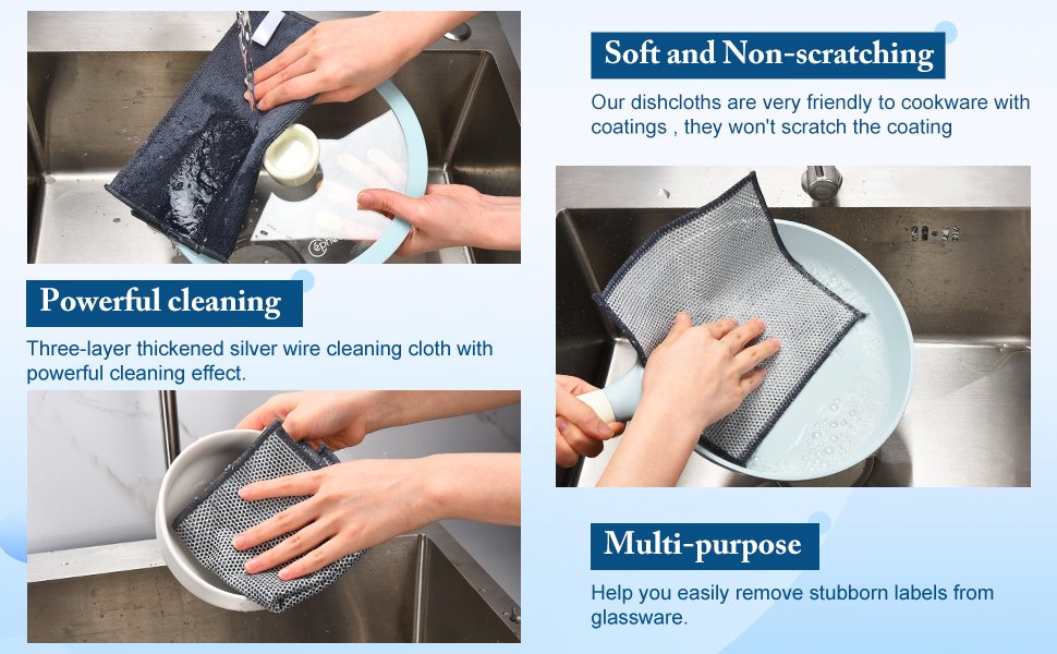 - Reusable: Our scratch- non scratch wire dishcloth rag is a reusable washed rag This steel wool scrubber undergoes special treatment for enhanced durability, capable of withstanding frequent use and cleaning. Additionally, it is easy to rinse after cleaning, The three-layer thickened cleaning effect is more pronounced, quickly releasing moisture and drying, leaving no odor. We’ve also added hooks that can be hung on the wall after use, saving space in the kitchen and making them easy to drain and clean. providing a convenient and efficient solution for kitchen cleaning.