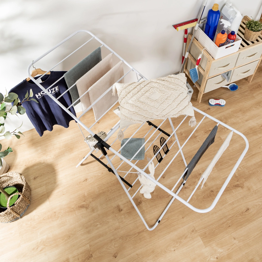 Transform Your Laundry Day with HOUZE: Embrace the HOUZE Menshar Gullwing QuickFold Rust-Free Airer Rack and transform your laundry days. Ideal for compact living areas. its space-saving design and rust-proof construction ensure a lasting. pristine look. free from rust stains and the bulkiness of traditional racks. Experience an efficient. stylish. and sustainable approach to laundry. making every day effortlessly manageable.