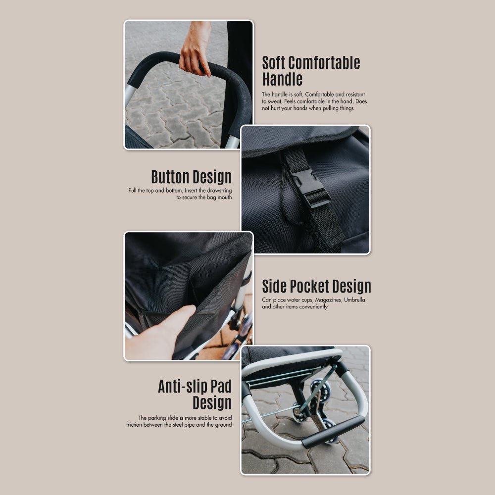 Effortless Shopping in the Heart of the City – With the HOUZE Aluminium Frame Stair Climber Shopping Trolley. your shopping trips transform from chores to pleasures. Imagine effortlessly gliding upstairs and your groceries secure in a waterproof. stylish trolley. The extra pockets provide convenient access to your essentials. while the foldable design means you can tuck the trolley away when not in use. This trolley isn’t just a shopping tool; it’s a lifestyle enhancer. allowing you to confidently and easily navigate Singapore’s vibrant streets.