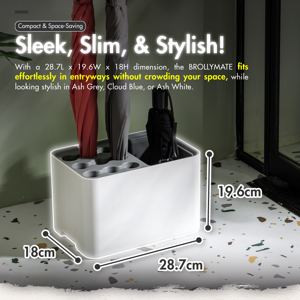 The BrollyMate Umbrella Stand Rack with Removable Drip Tray is the perfect combination of functionality and style. offering a dedicated storage solution for wet umbrellas while maintaining a sleek and sophisticated look. Whether used at home. in the office. or in a commercial space. this umbrella stand keeps your space dry. safe. and organized. making it an essential accessory for rainy days.