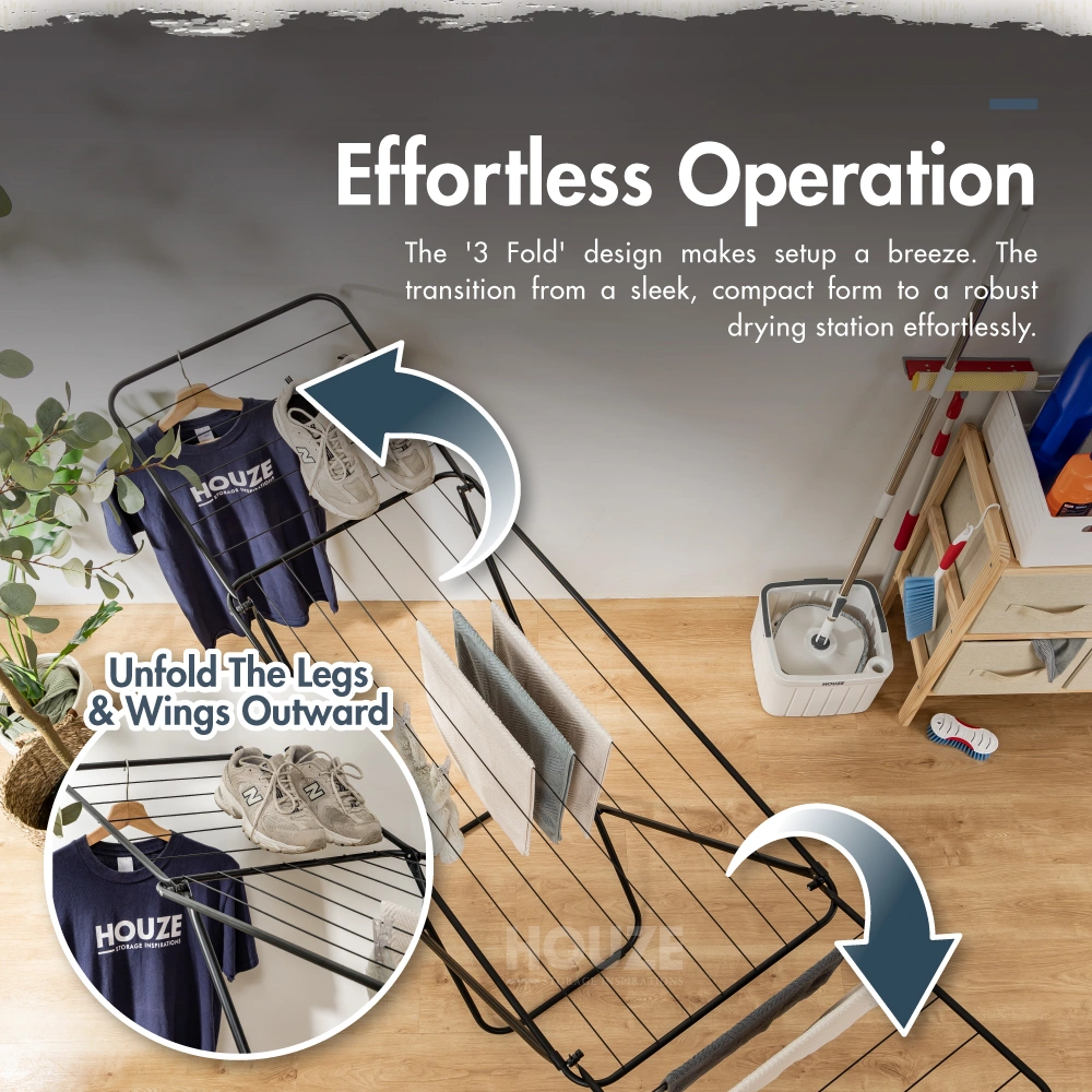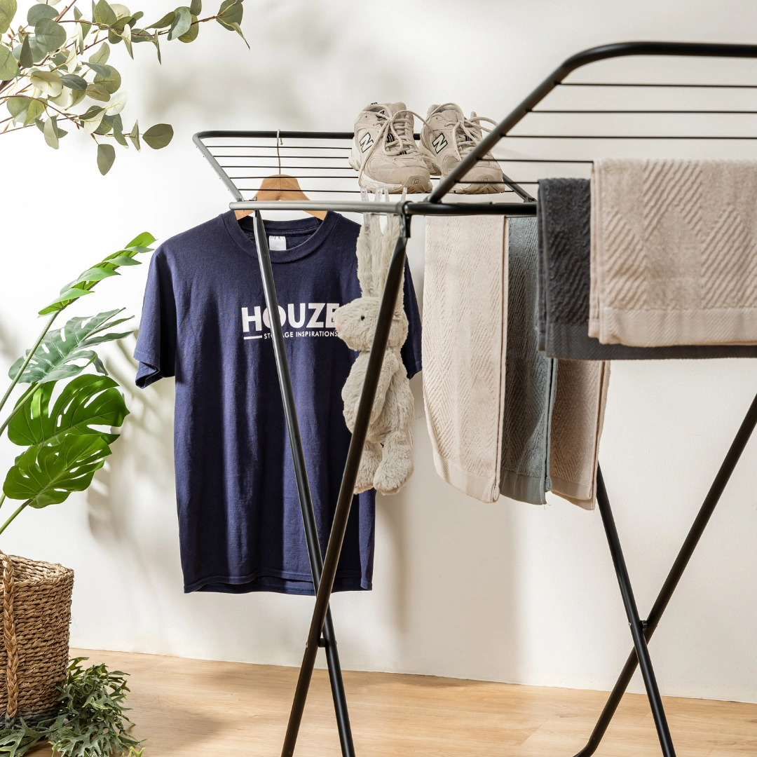 Elegant Look: Enhances your home with its minimalist black finish. Perfect for modern. eco-friendly Singapore living. the HOUZE Rack transforms laundry drying into an effortless. stylish affair.