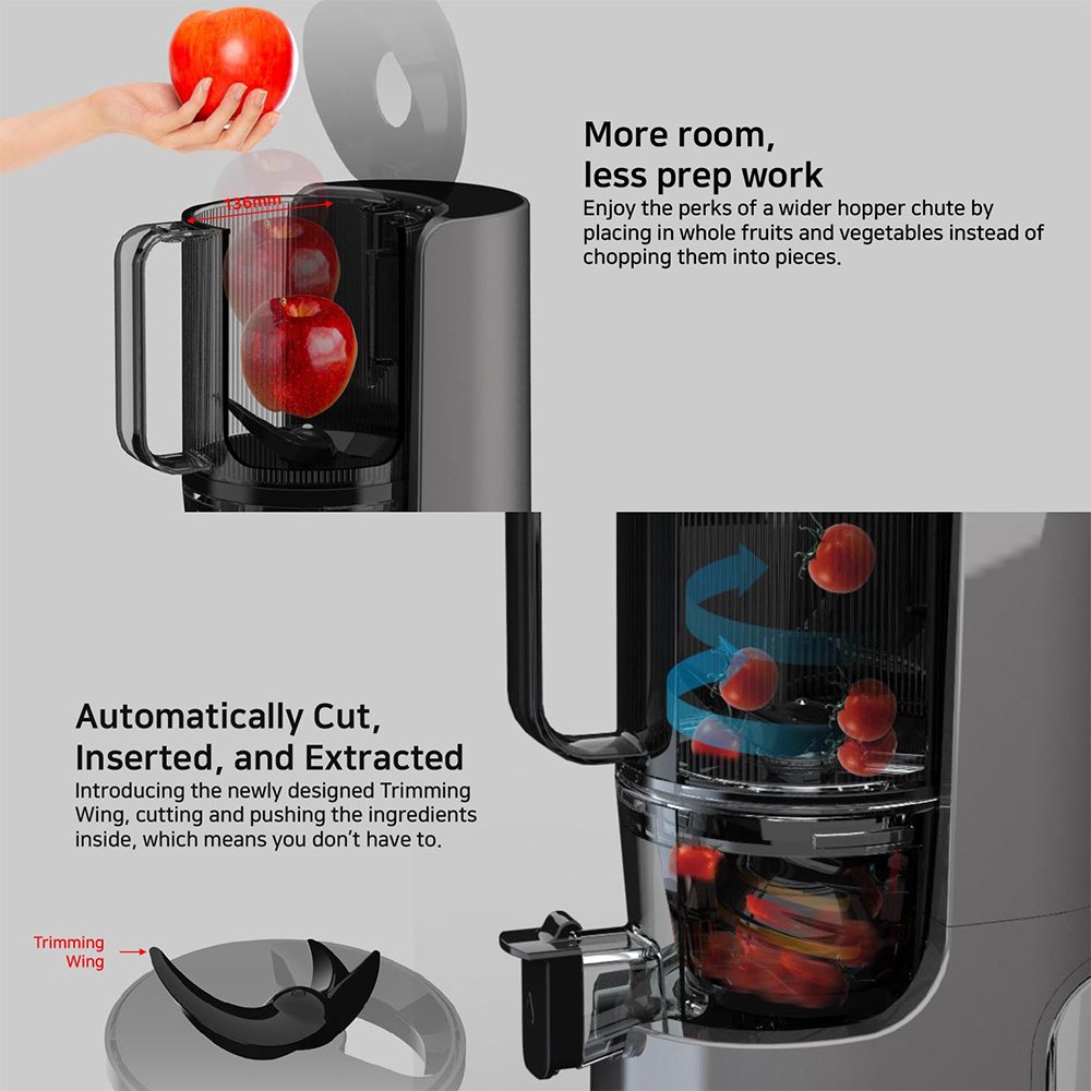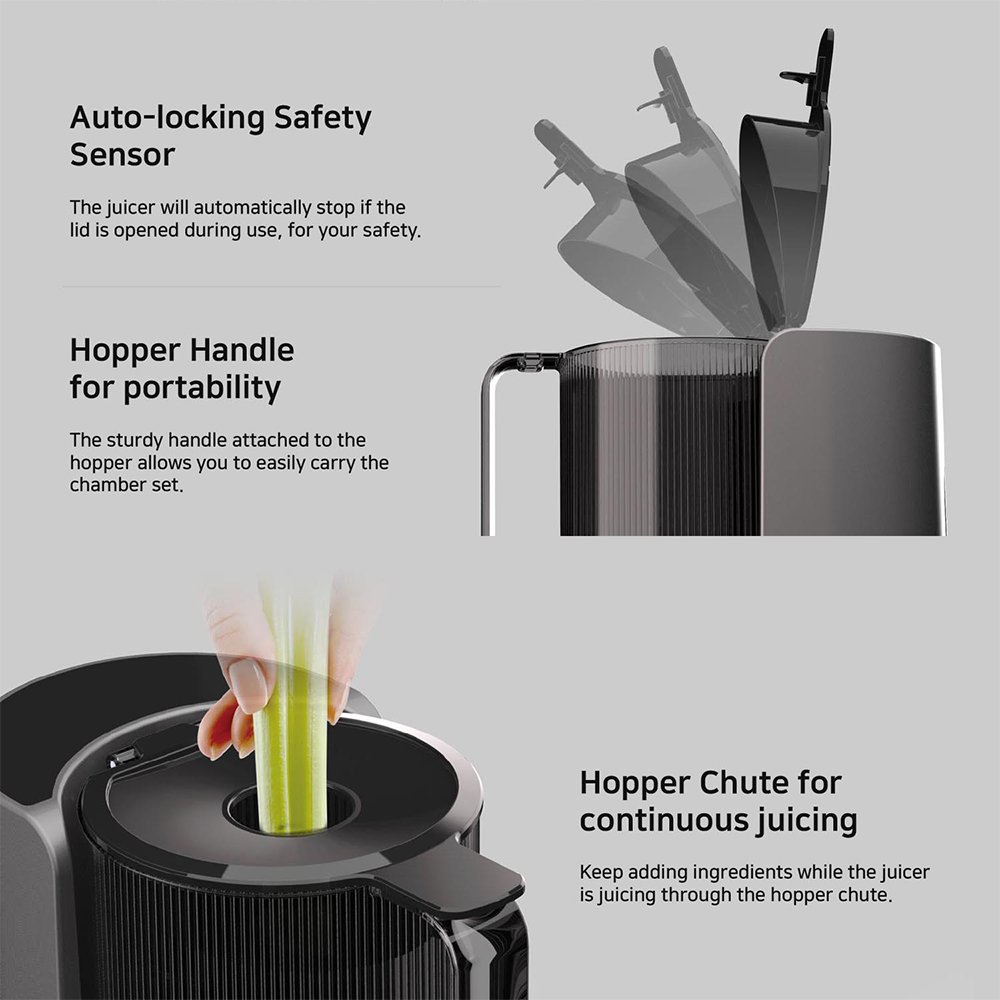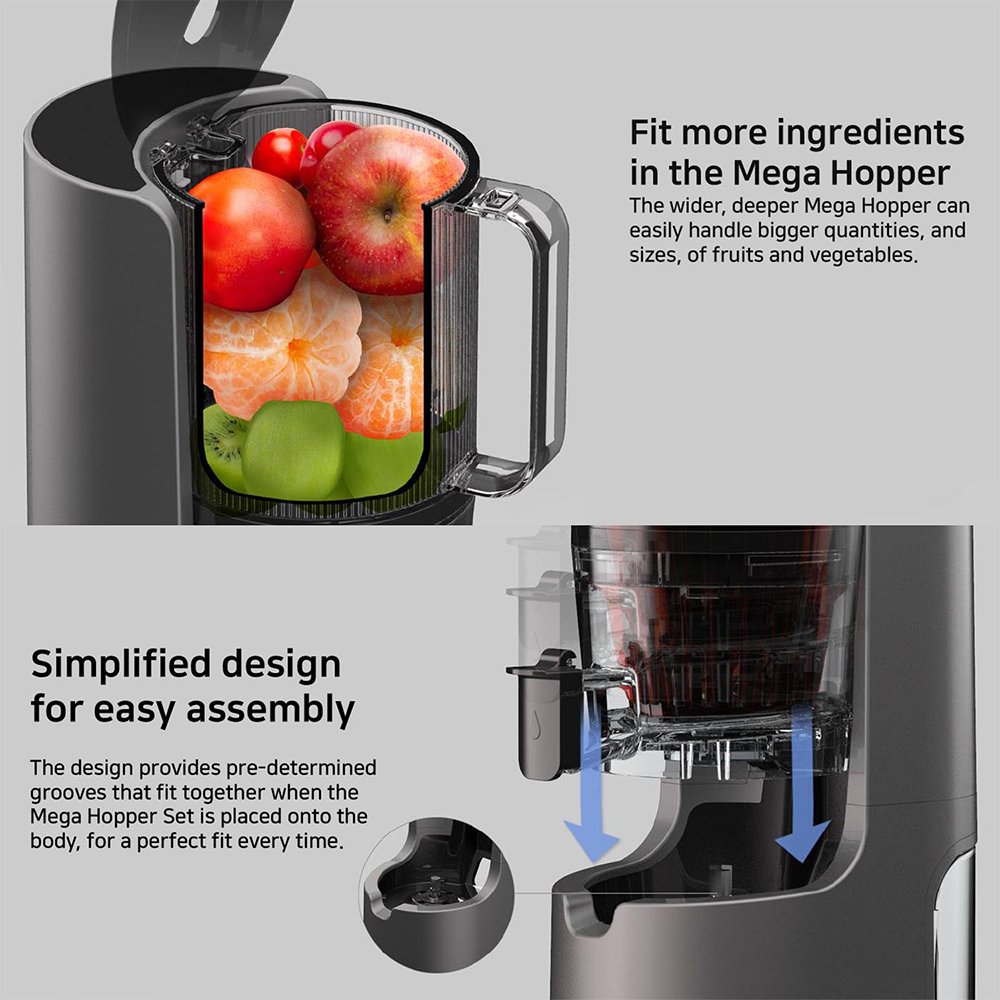 Self-Feeding Hopper: The H400 Slow Juicer comes with the highest volume of any self feeding hopper yet. This change is complimented by a larger opening. and a larger inlet to add more ingredients while the juicer is still running.