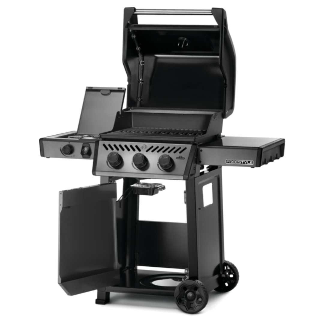 The Freestyle 365/425 Propane Gas Barbecue is a compact grill with premium features and unbeatable value. Ignited by the instant JETFIRE ignition system that lights your barbecue with a jet of flame easily. every time. Get the perfect sear over the cast iron porcelainized enamel cooking grids. Three stainless steel burners provide even heat. easily controlled and monitored by the onboard temperature gauge. Get the perfect restaurant sear or prepare side dishes while you grill with the infrared sear station side burner. The rugged wheels allow this barbecue to go where the action is. while the easy-to-fold right side shelve. featuring tool hangers and a bottle opener. make sure that the Freestyle meets your lifestyle and space.