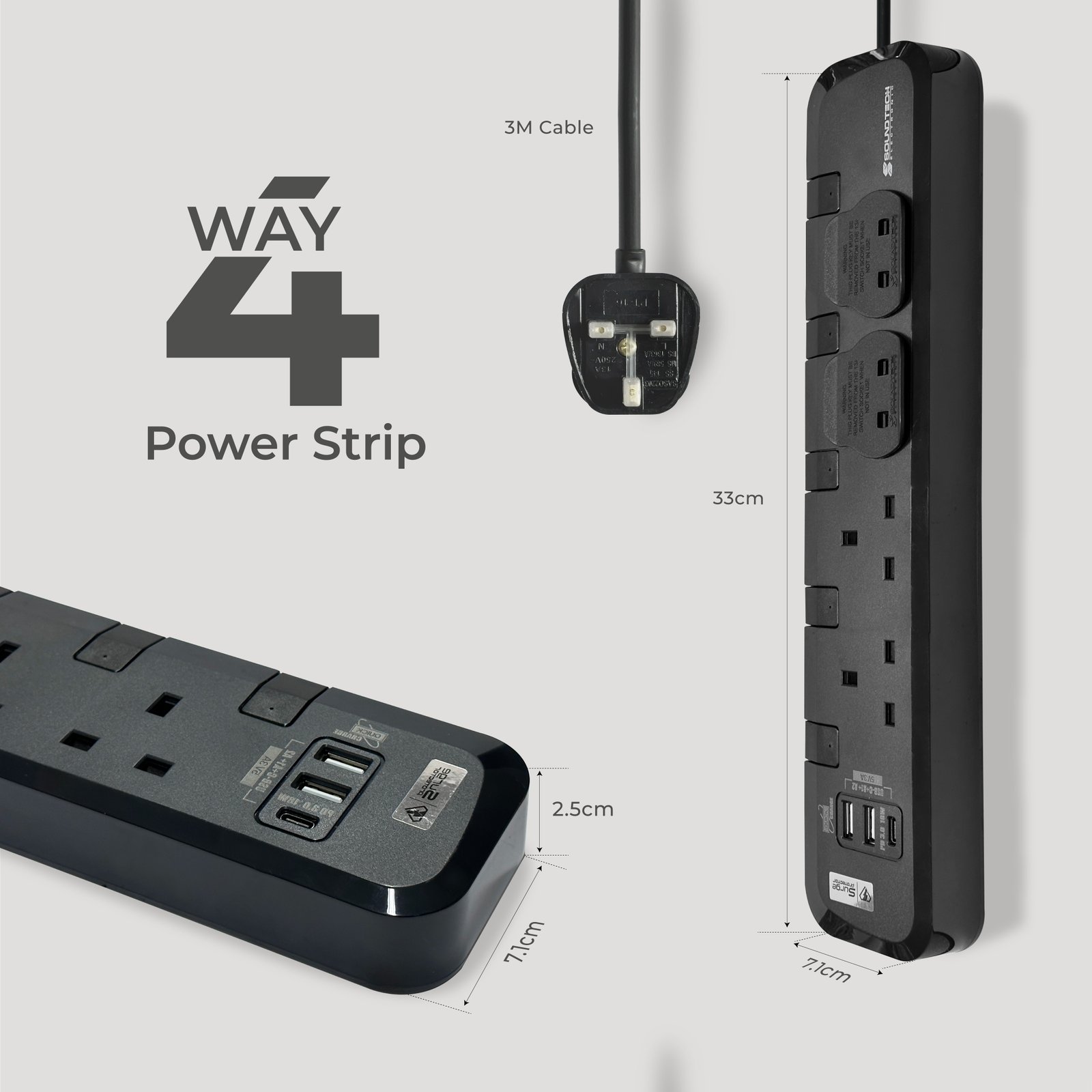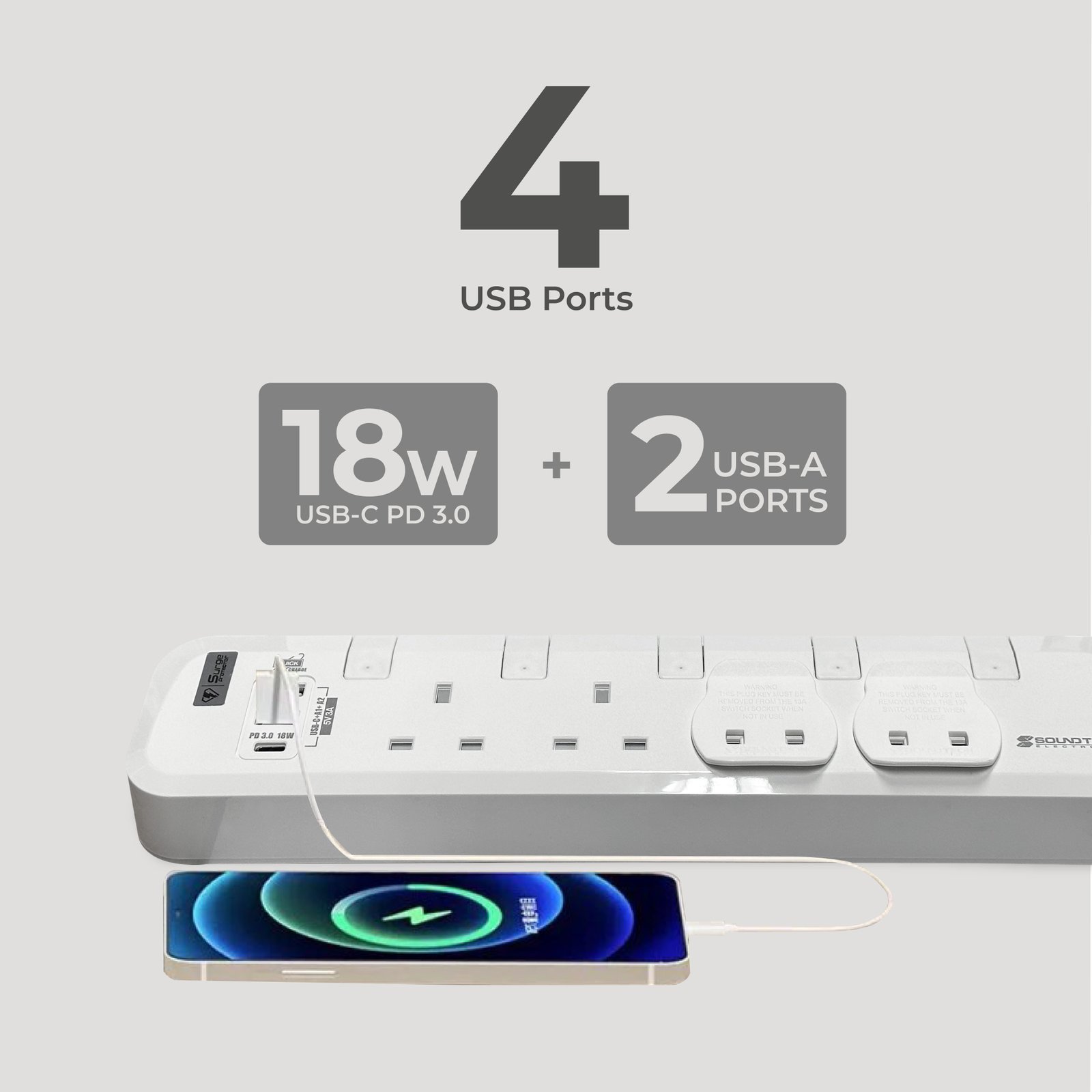 • USB-C (18W PD 3.0) + 2 USB-A PORTS